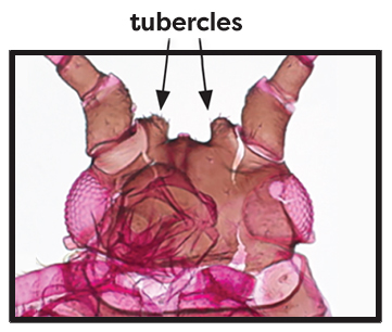 The good news is that there are only about six or so species of aphids common to greenhouses. By looking, with good magnification and lighting, from a top rear view, at the notch on their head between the antennae called the tubercles, you can differentiate these four species (see the chart on page 24 for the identifying characteristic and notes on biology).